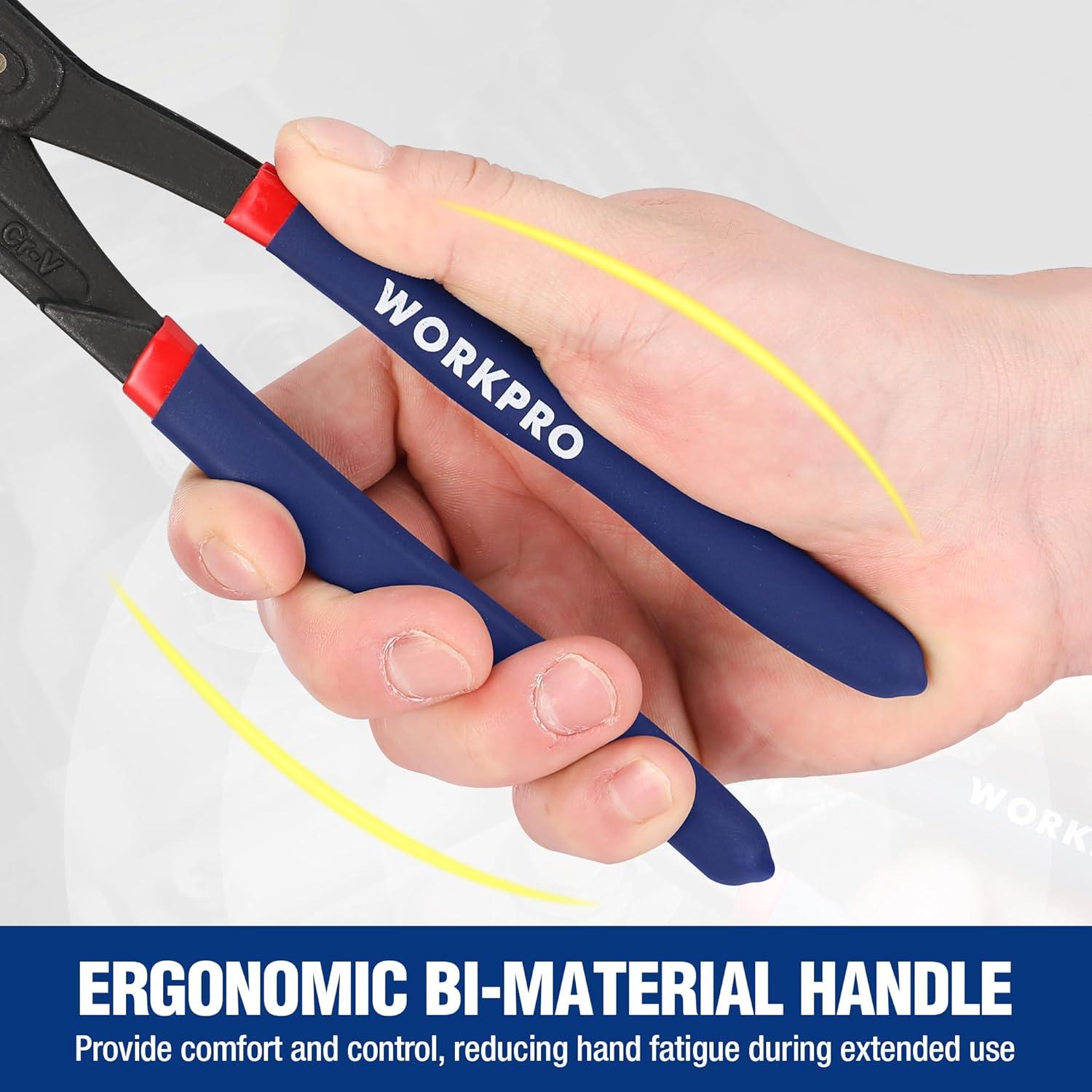 Longer Life: WORKPRO tongue and groove joint pliers are made from premium chrome vanadium steel for high strength and durability. The polished jaw and black phosphating enhance corrosion resistance, making them ideal for plumbers and DIY homeowners