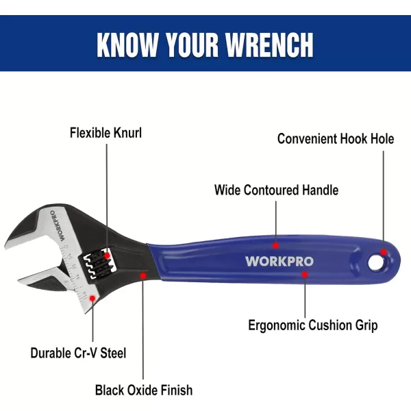 WORKPRO 2-piece Adjustable Wrench Set, 6-Inch & 10-Inch Wrenches, Wide Jaw Black Oxide Wrench With Cushion Grip, Metric & SAE Scales, Cr-V Steel, for Home, Garage, Workshop(10 inch)