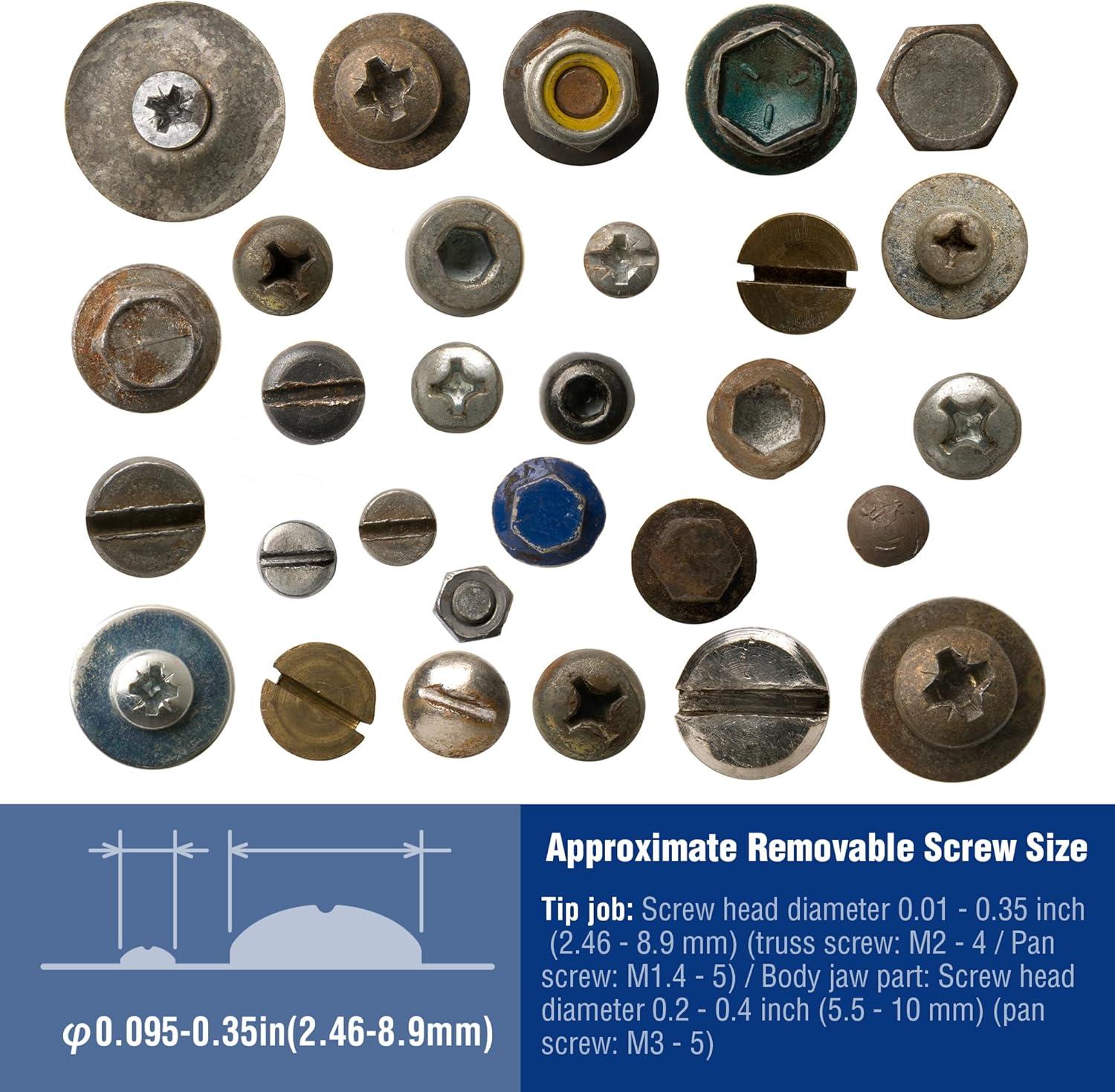 Approximate Removable Screw Size : Tip job: Screw head diameter 0.01 – 0.35 inch (2.46 – 8.9 mm) (truss screw: M2 – 4 / Pan screw: M1.4 – 5) / Body jaw part: Screw head diameter 0.2 – 0.4 inch (5.5 – 10 mm) (pan screw: M3 – 5)