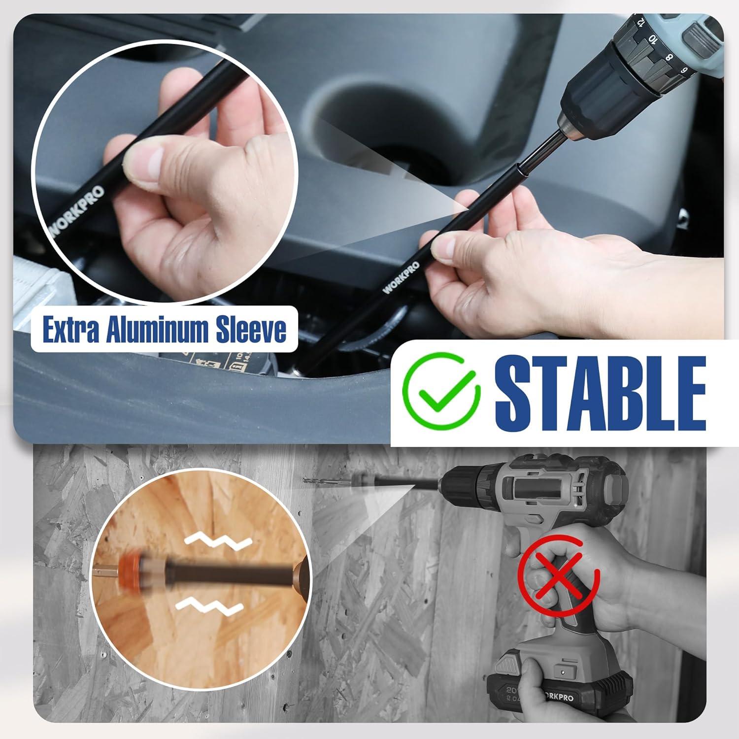 EXTRA ALUMINUM SLEEVE: The additional aluminum sleeve design on the drill bit holder allows you to support the outer sleeve with your hand while using it, without affecting its rotation. This thoughtful design ensures stability and precise control in all drilling and screwdriver tasks