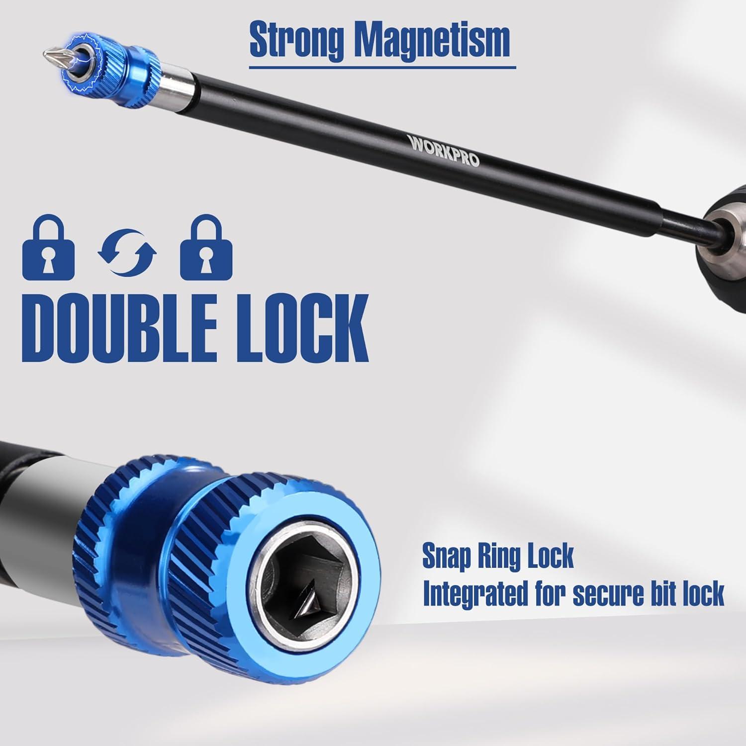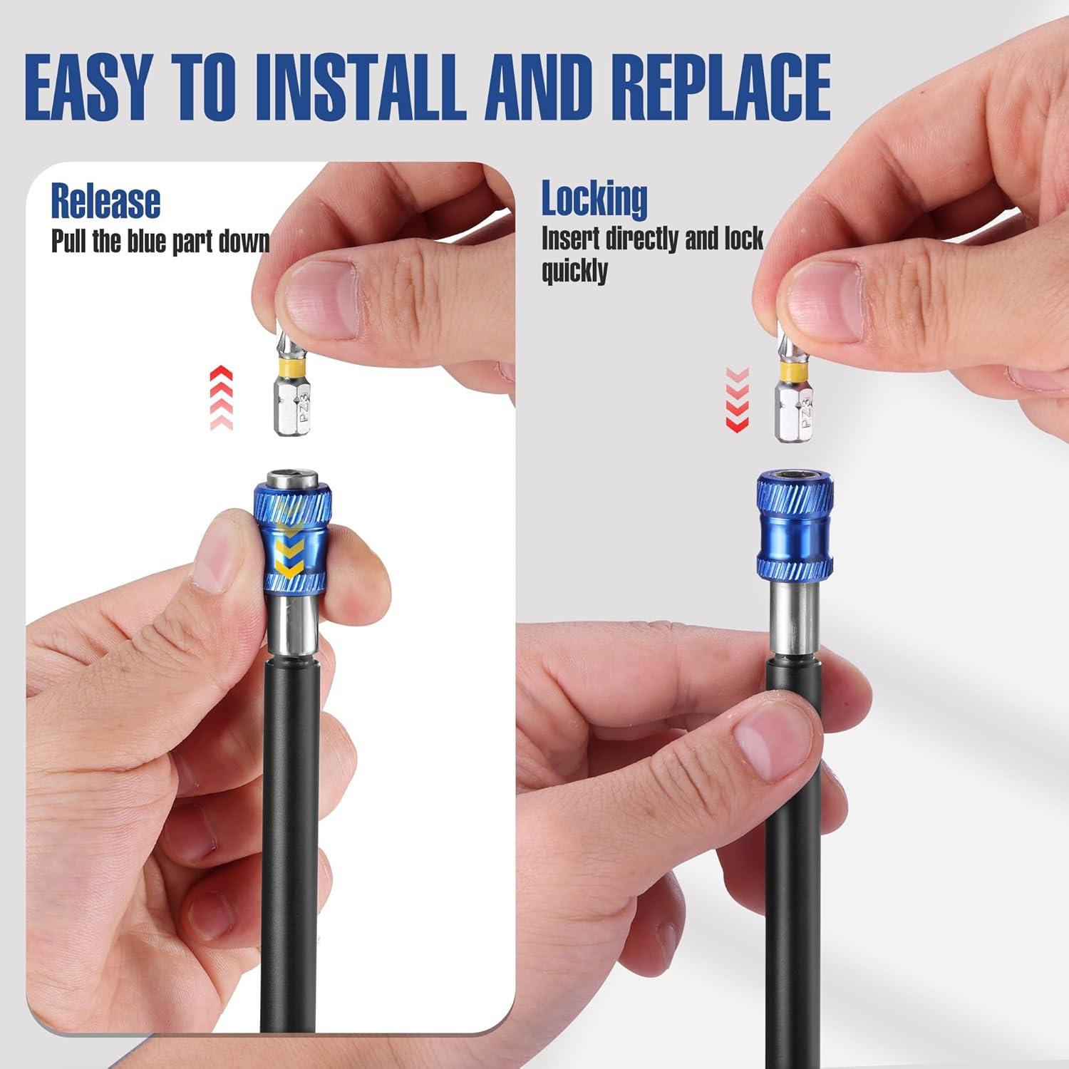 DUAL LOCK: The magnetic bit holder features a strong built-in magnet and a snap ring lock for dual locking, ensuring your screwdriver bits and drill are securely held in place. Simply slide the locking mechanism on the head of the quick-release bit holder for quick and easy changes, greatly enhancing work efficiency and precision
