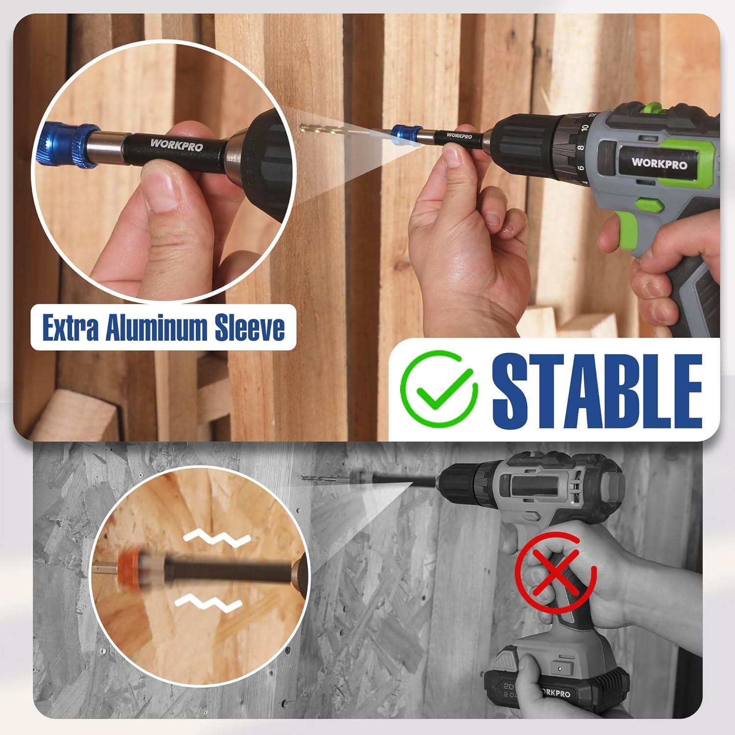 EXTRA ALUMINUM SLEEVE: The additional aluminum sleeve design on the drill bit holder allows you to support the outer sleeve with your hand while using it, without affecting its rotation. This thoughtful design ensures stability and precise control in all drilling and screwdriver tasks