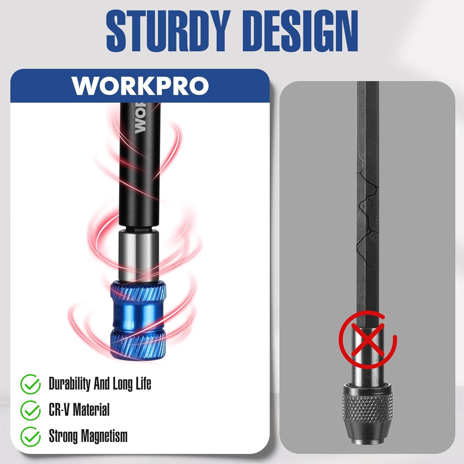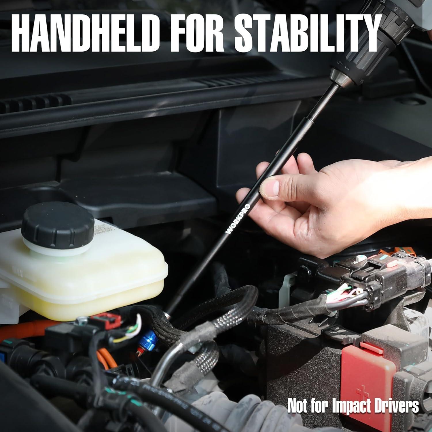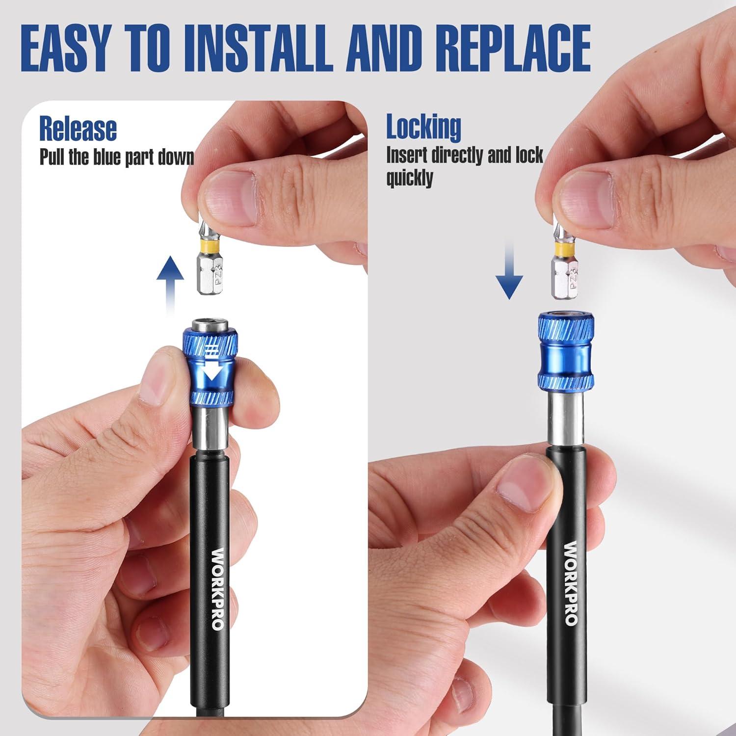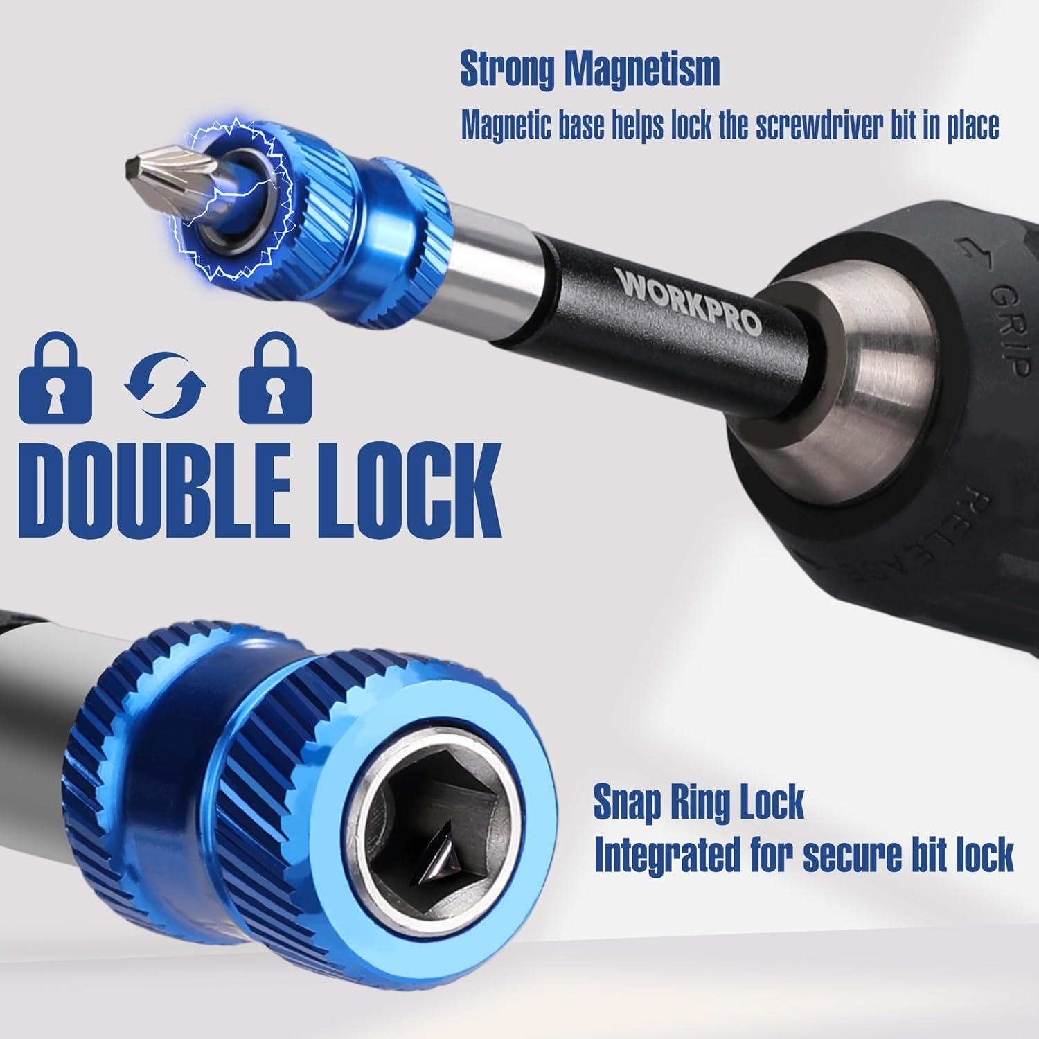 DUAL LOCK: The magnetic bit holder features a strong built-in magnet and a snap ring lock for dual locking, ensuring your screwdriver bits and drill are securely held in place. Simply slide the locking mechanism on the head of the quick-release bit holder for quick and easy changes, greatly enhancing work efficiency and precision