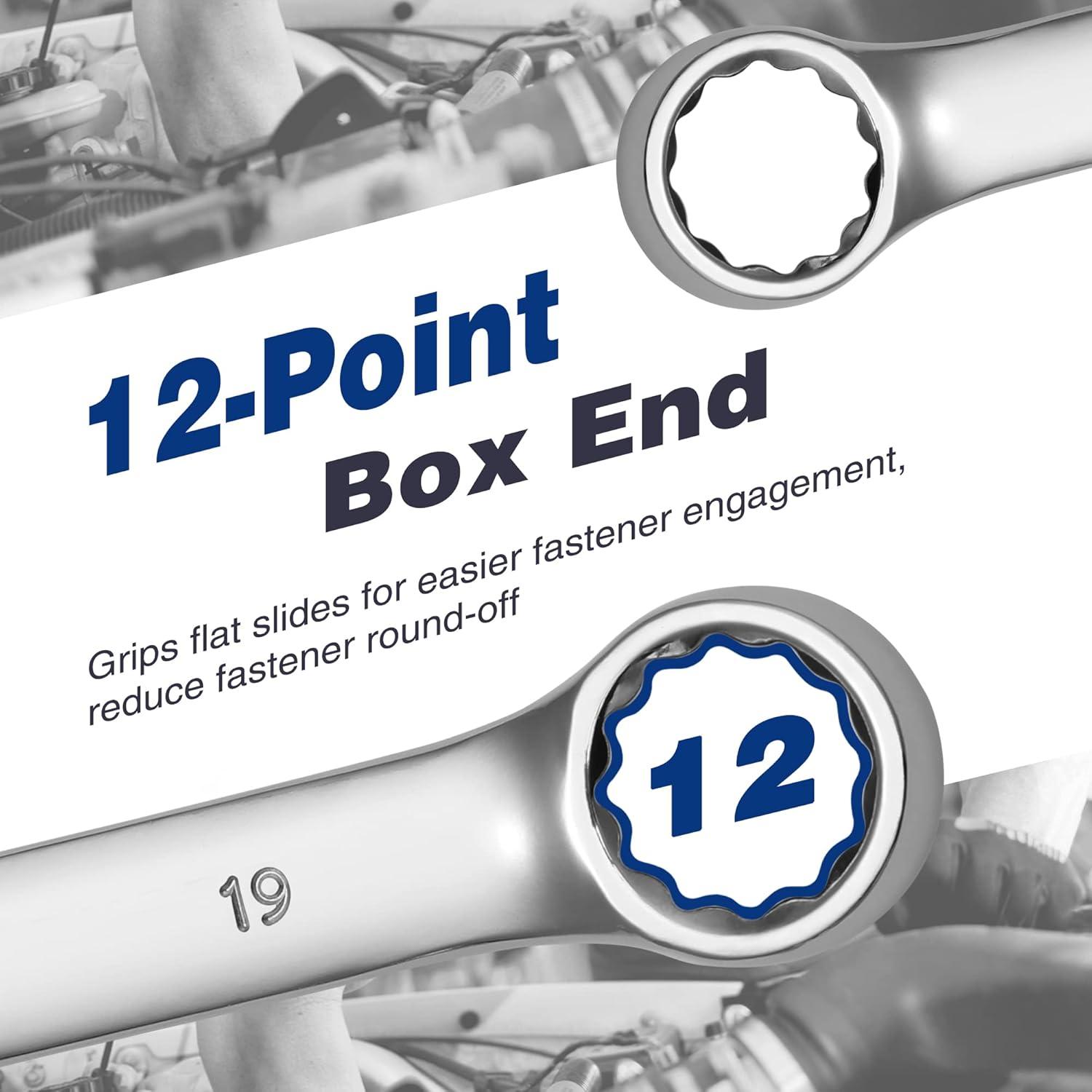 STRONGER GRIP, precisely manufactured 12-point box end wrench set nicely fit on fasteners, delivering better torque and prevents fastener corners from rounding off