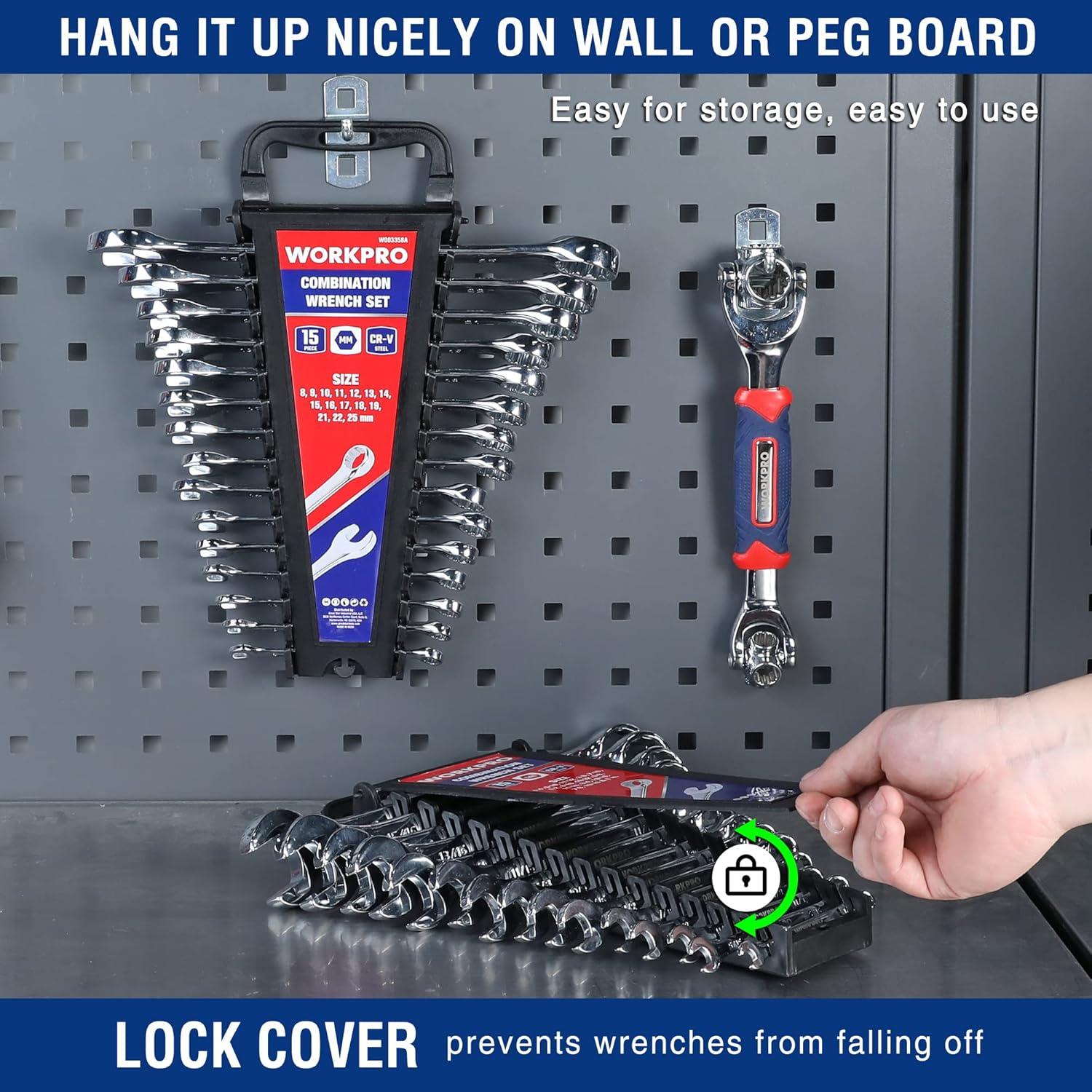 KEEP ORGANIZED, Comes with a compact organizing rack with cover that lock the wrenches during move. Large stamped size markings on wrenches for quick identification