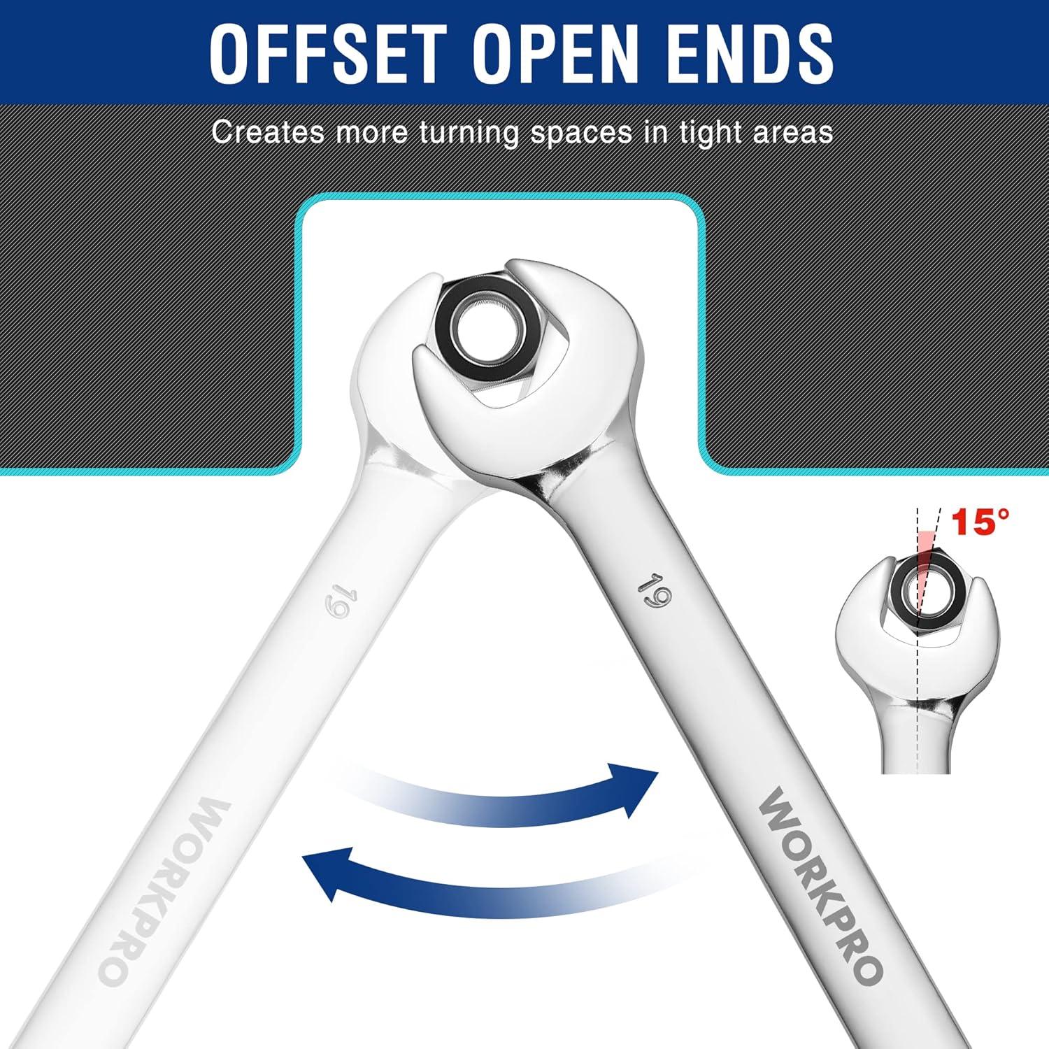 APPLY FORCE EASIER, offset open end wrench set creates more turning spaces in tight areas, angle raised boxed end creates clearance for hand or obstructions, also provides more leverage and power