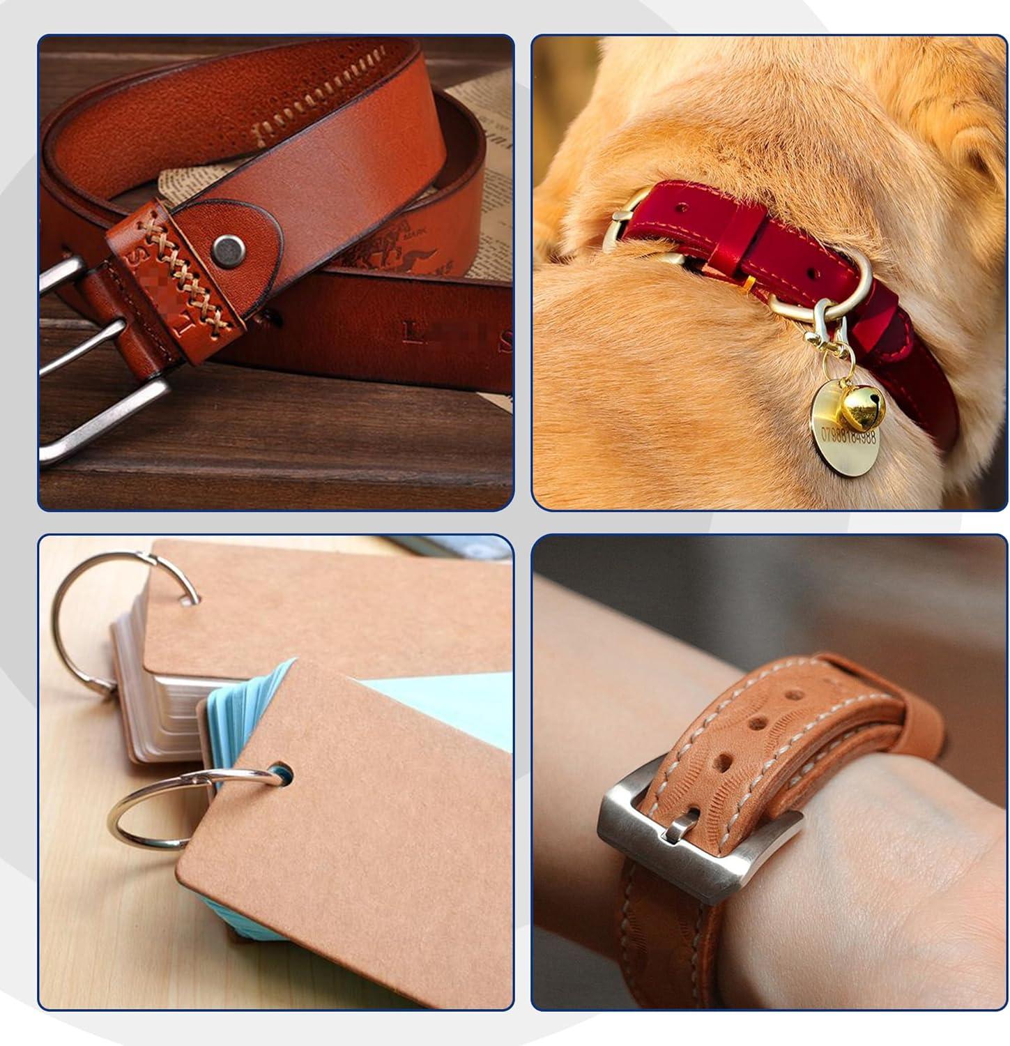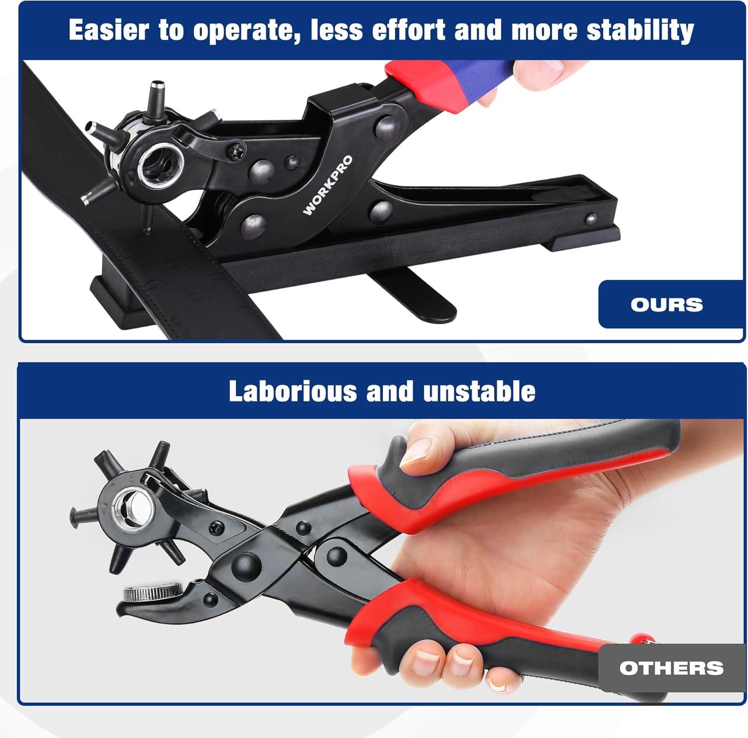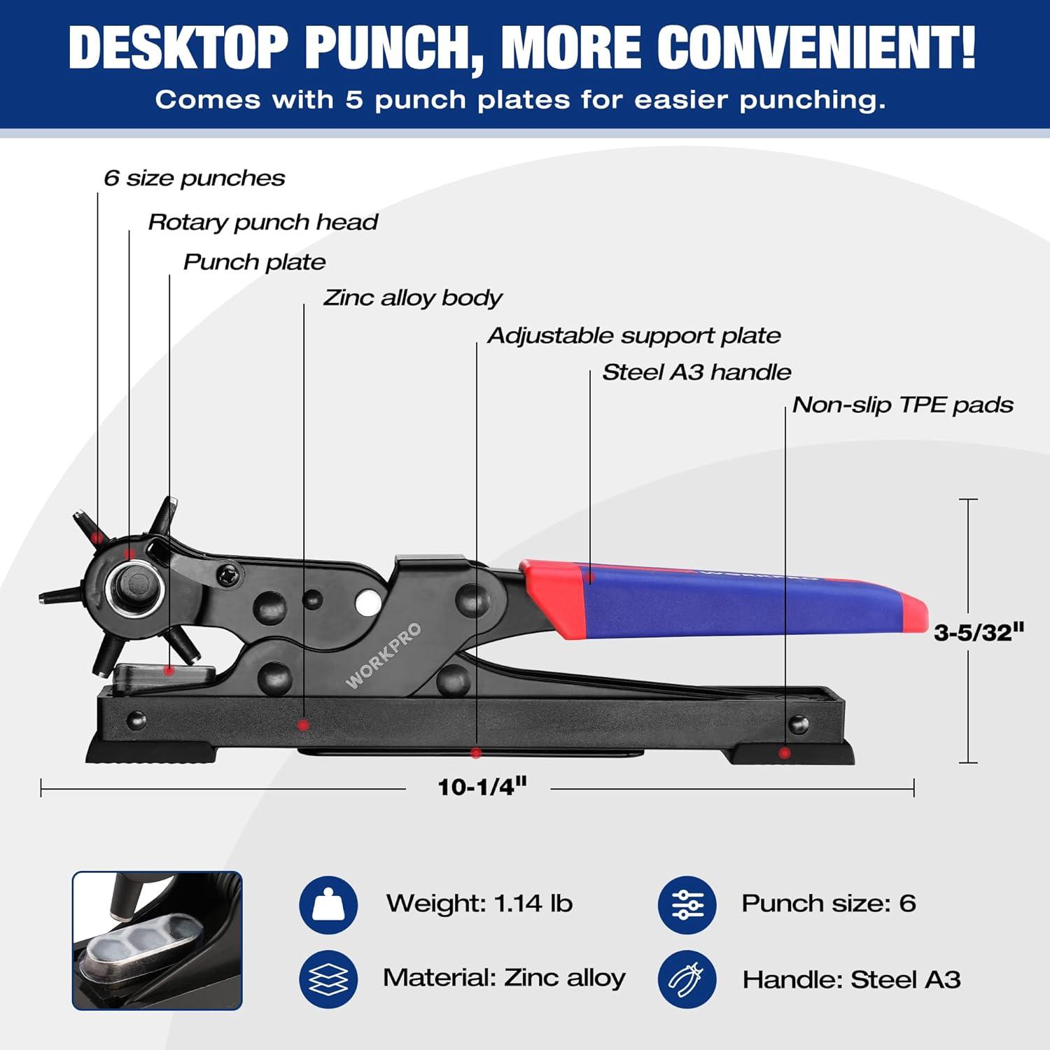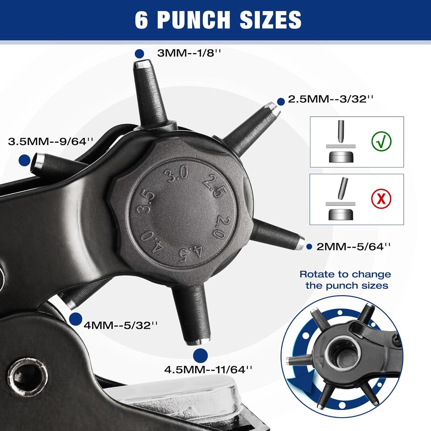 Package 2: WORKPRO Desktop Leather Hole Punch Set – The rotary punch head can be rotated to change different punching sizes(5/64'' 3/32'' 1/8'' 9/64'' 5/32'' 11/64''). One side of the 6-hole puncher head is a plastic disk, which is engraved with the size of each punch so that you can view it when using